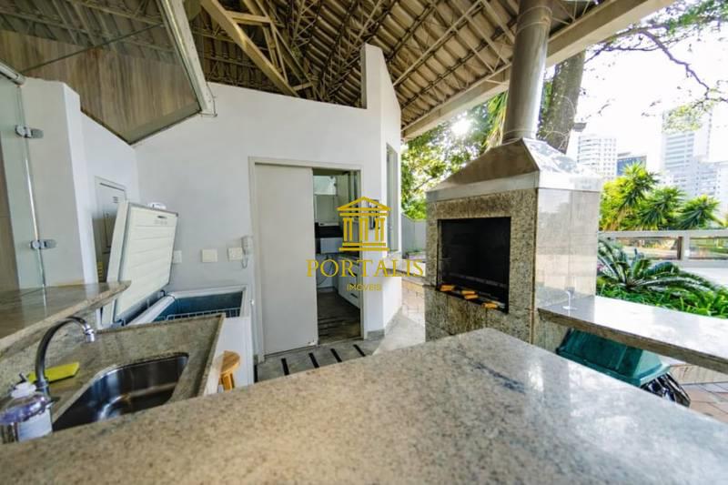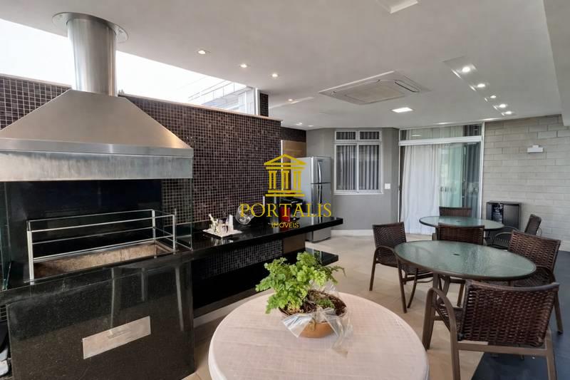 Espaço gourmet sofisticado, equipado com churrasqueira, armários planejados, bancada em granito, ar-condicionado central e projeto de iluminação cuidadosamente elaborado.